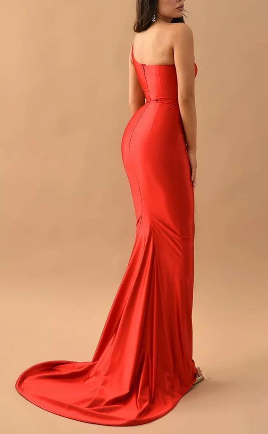 RP822-New Red Mermaid One Shoulder Ruched Long Prom Evening Dresses Formal Party Gowns With Cut-Out