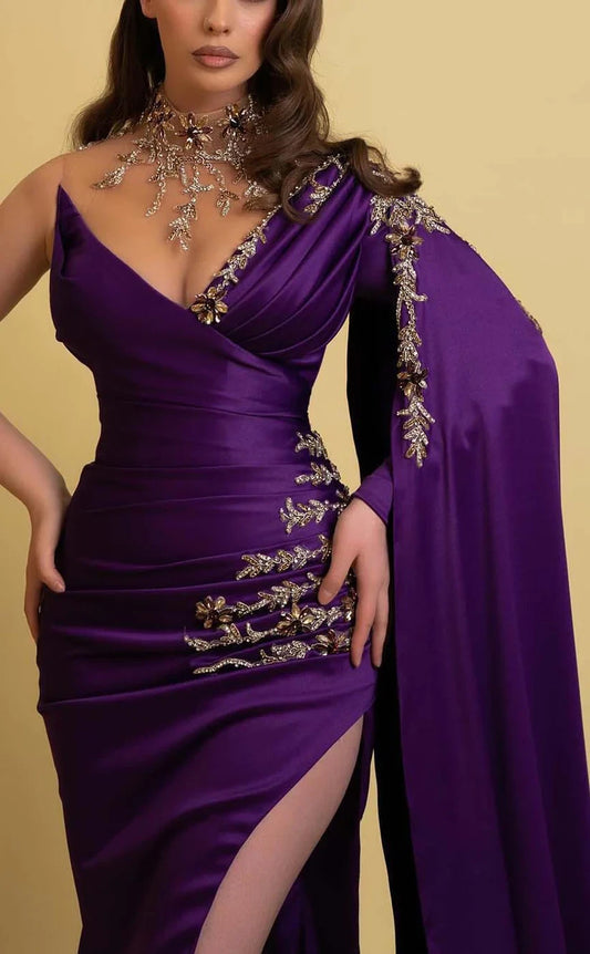 RP823-New Purple Mermaid One Shoulder Ruched Appliqued One Long Sleeve Prom Evening Dresses Formal Party Gowns With Side Slit