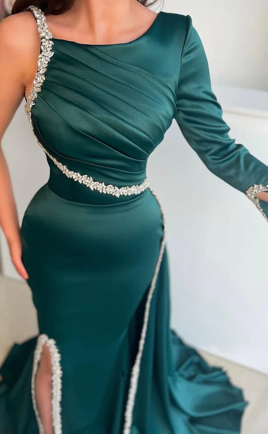 RP2019-Elegant Green Mermaid One Shoulder Cyrstals Long Sleeves Satin Prom Evening Dresses Formal Party Gowns With Slit