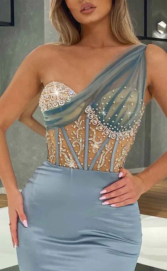 RP1946-Unique Mermaid One Shoulder Pleated Crystals Sleeveless Satin Prom Evening Dresses Formal Party Gowns With Slit