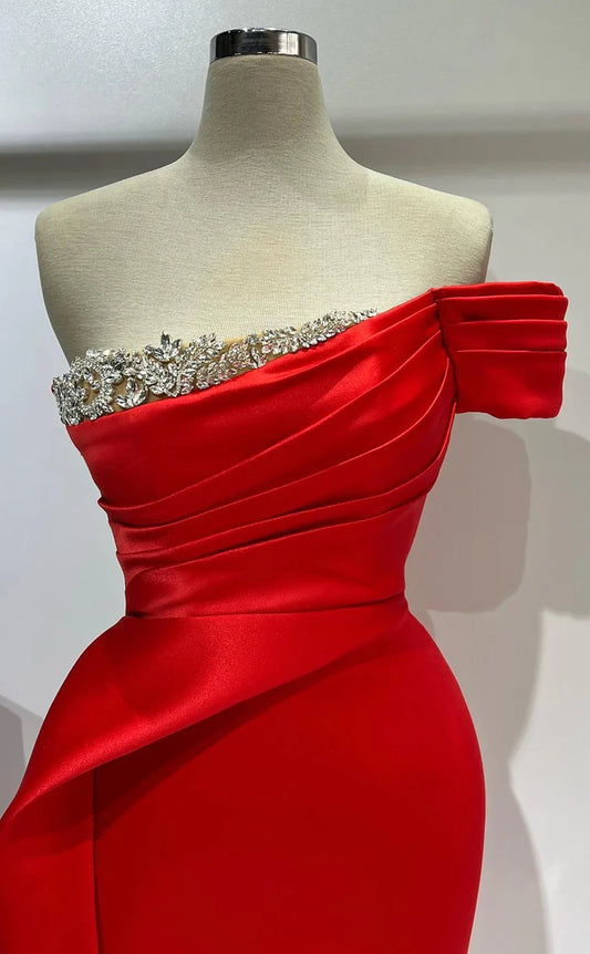 RP1961-Unique Red Mermaid One Shoulder Beaded Pleated Sleeveless Satin Prom Evening Dresses Formal Party Gowns With Slit