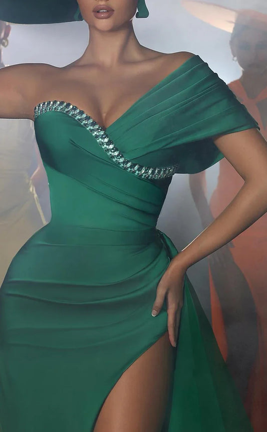 RP1940-Unique Green Mermaid One Shoulder Pleated Crystals Sleeveless Satin Prom Evening Dresses Formal Party Gowns With Slit