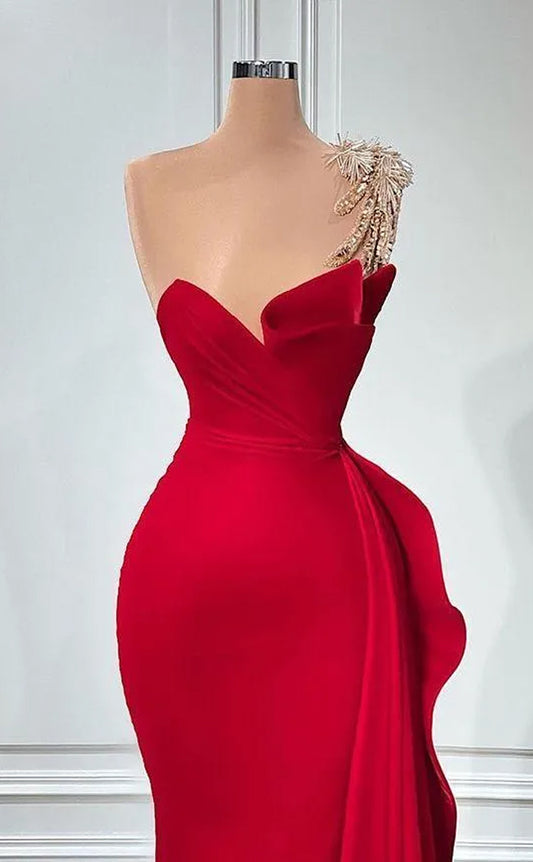 RP1459-Elegant Red Mermaid One Shoulder Beaded Sleeveless Prom Evening Dresses Formal Party Gowns With Cut-out