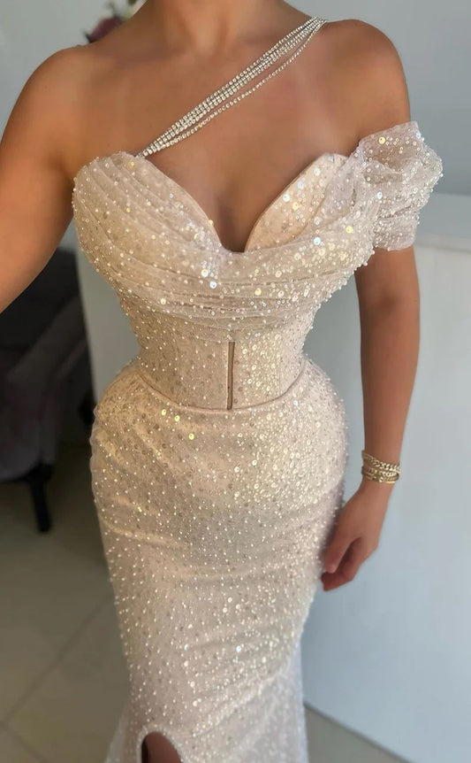 RP1536-Sparkling Ivory Mermaid One Shoulder Beaded Sequins Sleeveless Prom Evening Dresses Formal Party Gowns With Slit
