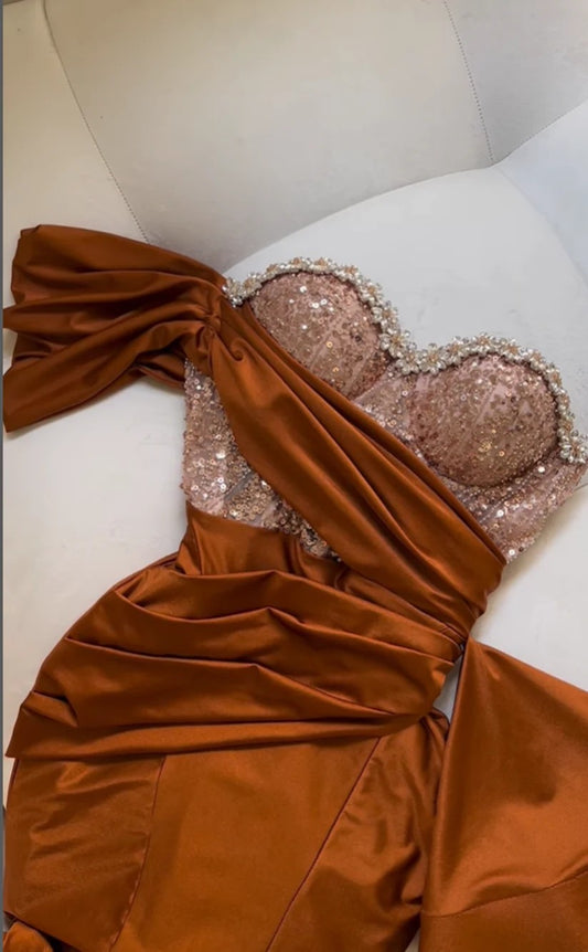 RP1455-Elegant Brown Mermaid One Shoulder Ruched Beaded Sleeveless Satin Prom Evening Dresses Formal Party Gowns With Slit