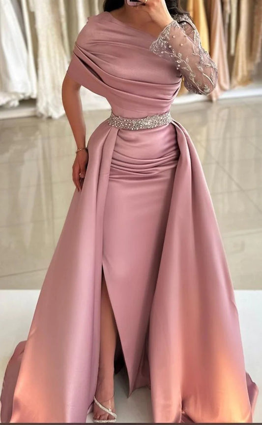 RP1429-Elegant Pink Mermaid One Shoulder Ruched Beaded Long Sleeve Satin Prom Evening Dresses Formal Party Gowns With Slit