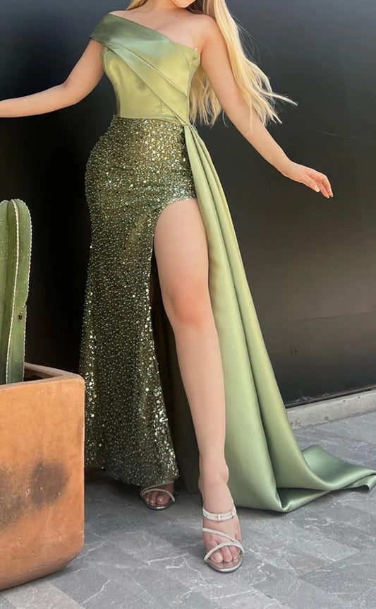 RP1352-Charming Olive Mermaid One Shoulder Sequined One Long Sleeve Prom Evening Dresses Formal Party Gowns