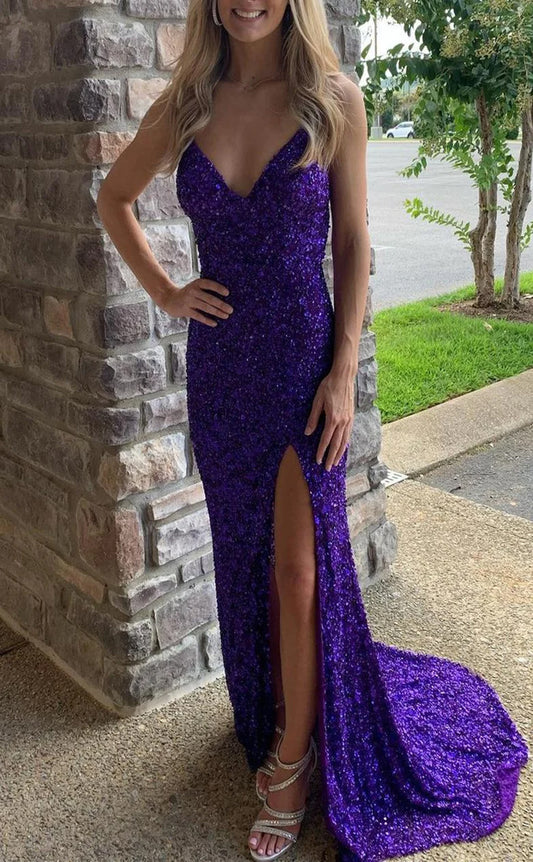 RP136-Sparkling Mermaid Spaghetti Sleeveless Sequins Long Prom Evening Formal Party Gowns With Slit
