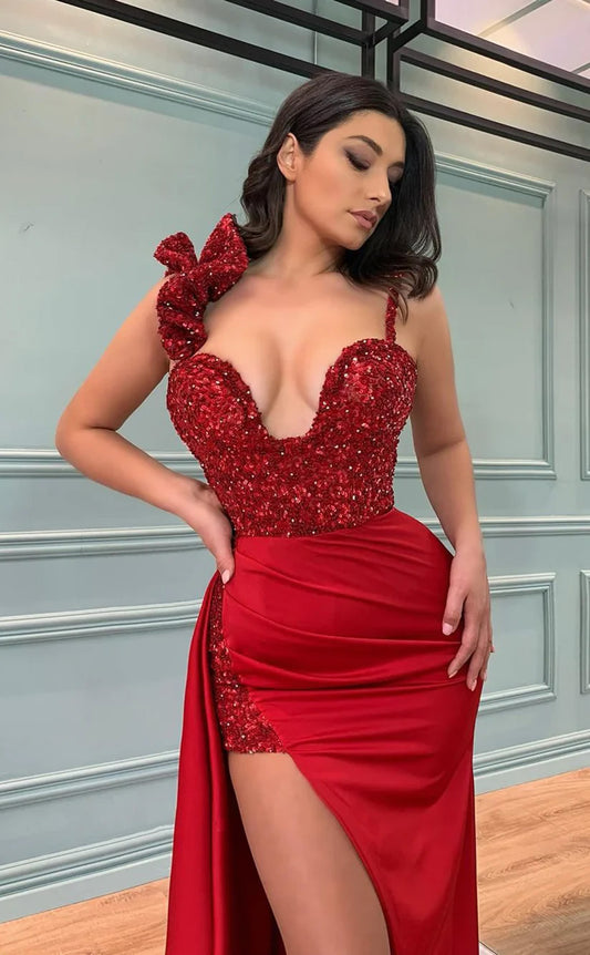 RP145-Red Mermaid Spaghetti Sleeveless Sequins Long Prom Evening Dresses Formal Party Gowns With Slit