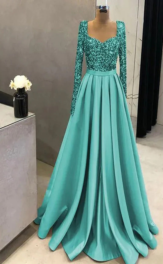 RP046-Elegant A-Line Deep V-Neck Long Sleeves Sequins Side Split Satin Long Women's Prom Evening Dresses Formal Party Gowns