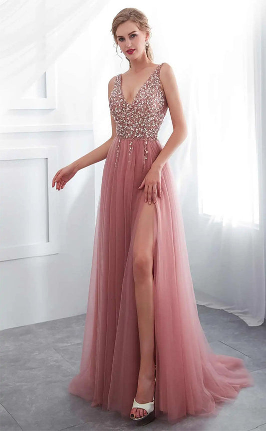 RP045-Gorgeous A-Line Deep V-Neck Beads Sequins Side Split Lace up Back Tulle Long Prom Evening Dresses Formal Party Gowns