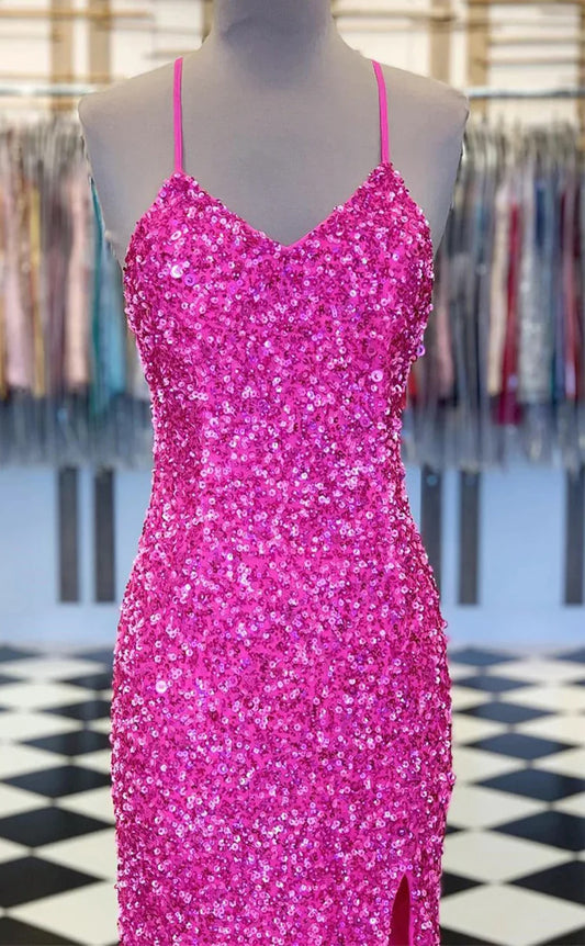 RP053-Sparkling Mermaid Spaghetti Backless Side Split Long Sequins Formal Occasions Prom Evening Dresses Party Gowns
