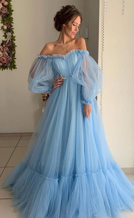 RP048-Sky Blue A-Line Off the Shoulder Puffy Long Sleeves Pleated Appliques Lace up Tulle Long Formal Prom Evening Party Gowns