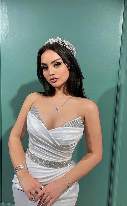 RP085-White Mermaid Sweetheart Sleeveless Beads Crystals Sash Pleated High Slit Satin Long Evening Dresses Prom Formal Party Gowns