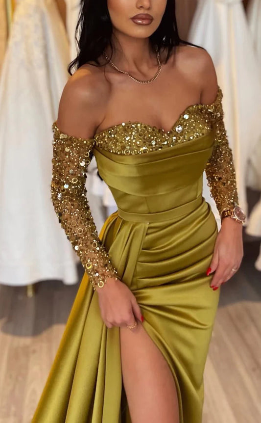 RP005-Charming Mermaid Beadings Side Slit Off The Shoulder Long Sleeve Train Satin Evening Dress Formal Prom Dresses Party Gowns