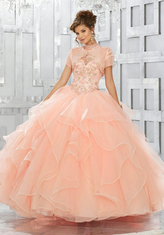 Organza Ball Gowns Coral Tulle Crystal Appliques Lace up Quinceanera Dress