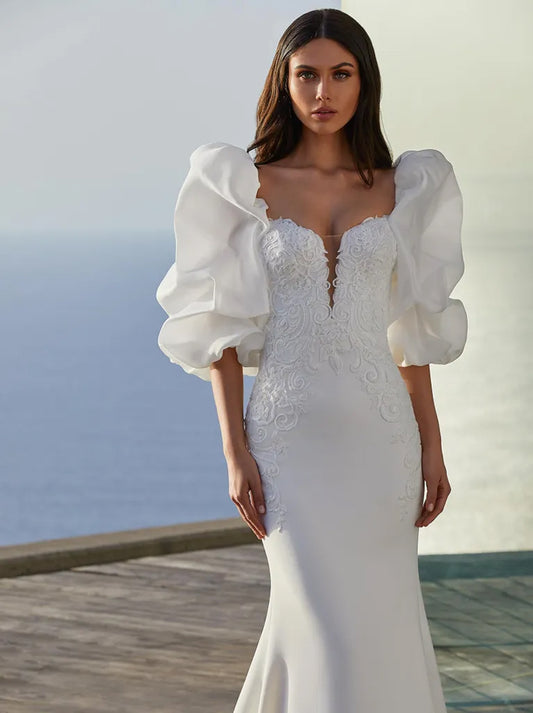 Gorgeous & Charming Mermaid Wedding Dresses Sweetheart Appliqued Satin Sweep Train Bridal Gowns With Puffy Sleeves