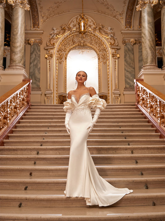Gorgeous & Charming Mermaid Wedding Dresses Sweetheart Beads Satin Court Train Bridal Gowns With Detachable Sleeves