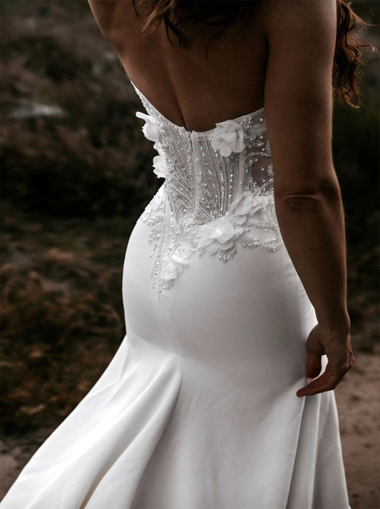 Simple & Elegant Mermaid Wedding Dresses Sweetheart Beads Appliqued Satin Sweep Train Bridal Gowns Custom