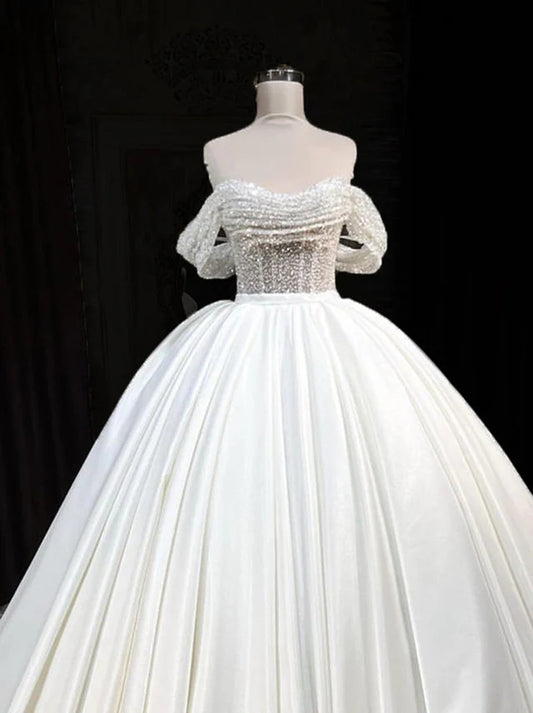 Modern Ball Gown Wedding Dresses Stweetheart Off The Shoulder Sequins Pleated Court Train Satin Bridal Gowns Custom Made