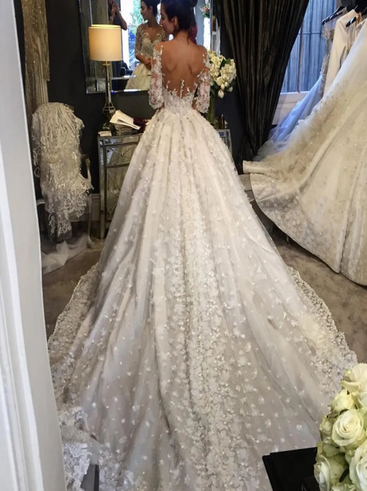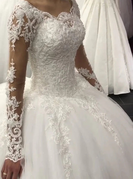 Elegant Ball Gown Wedding Dresses Illusion Scoop Long Sleeves Appliqued Sequins Tulle Sweep Train Bridal Gowns Custom Made