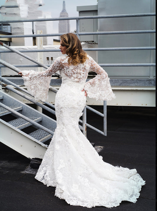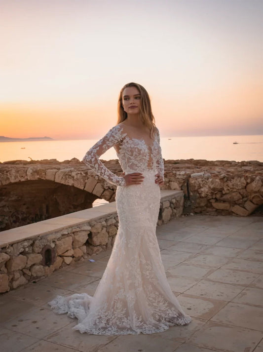 Elegant & Gorgeous Mermaid Boho Wedding Dresses Scoop Appliqued Long Sleeves Sweep Train Tulle Bridal Gowns Custom