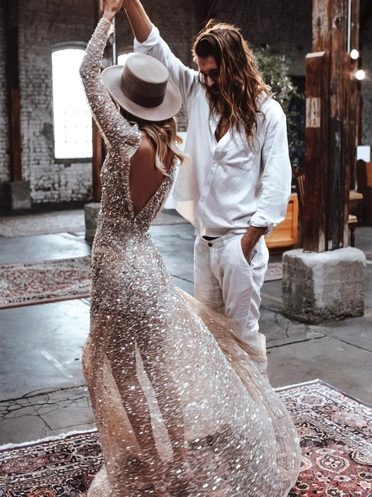 Sparkling A-Line Wedding Dresses Scoop Long Sleeves Sequins Beads Backless Sequins Sweep Train Bridal Gowns Custom Made
