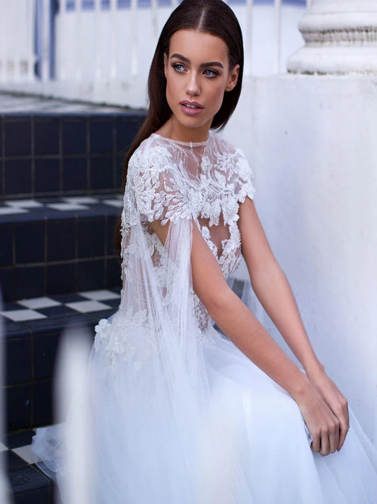 Elegant & Classic A-Line Wedding Dresses Scoop Sequins Appliqued Cap Sleeves Court Train Tulle Bridal Gowns Custom With Detachable Jacket