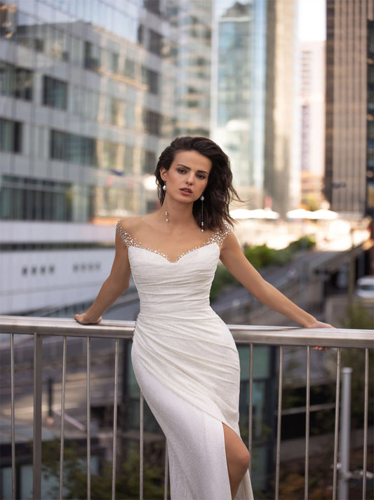Gorgeous & Elegant Mermaid Wedding Dresses Scoop Beads Sequins Satin Court Train Bridal Gowns With Slit