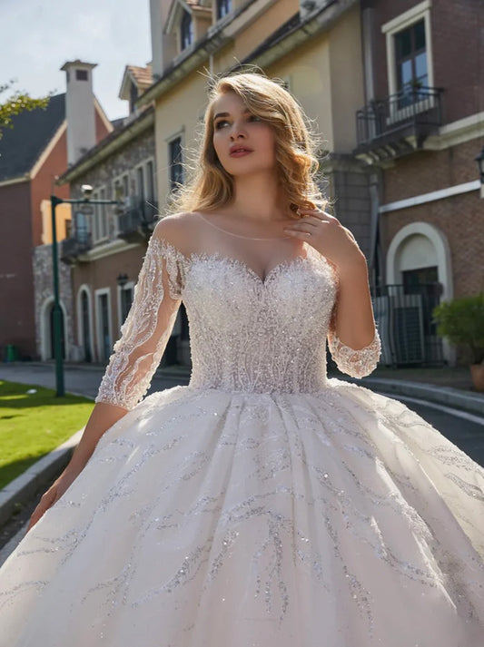 Lusurious Ball Gown Wedding Dresses Illusion Scoop Beads Sequins Half Sleeves Lace Up Tulle Bridal Gowns Custom Made