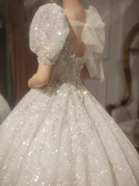 Sparkling Ball Gown Wedding Dresses Strapless Beads Crystals Puffy Sleeves Lace Up Tulle Court Train Bridal Gowns Custom Made