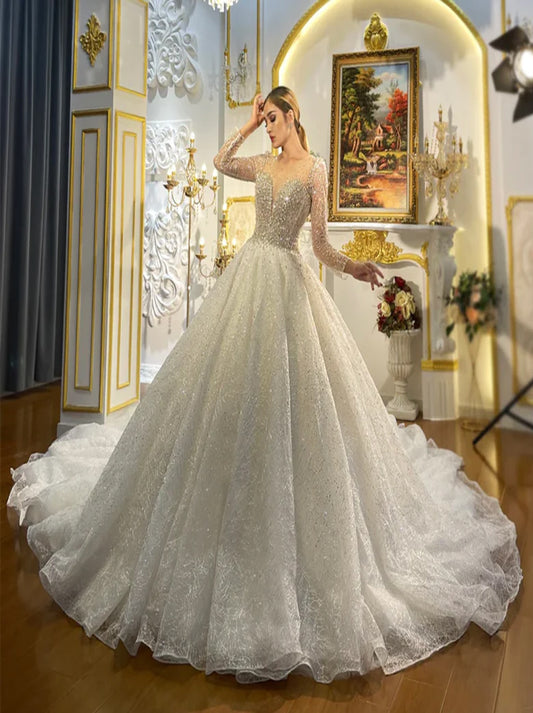 Sparkling Ball Gown Wedding Dresses Scoop Beads Crystals Sequins Illusion Long Sleeves Lace Up Tulle Court Train Bridal Gowns Custom Made
