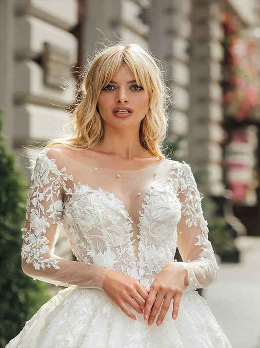 Ivory A-Line Wedding Dresses Scoop Appliques Illusion Long Sleeves Zipper Tulle Sweep Train Bridal Gowns Custom Made