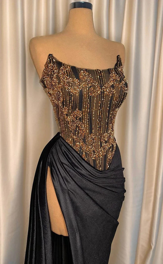 RP365-Elegant Black Sheath/Column Strapless Pleated Beaded Sleeveless Prom Evening Dresses Formal Party Gowns With Slit