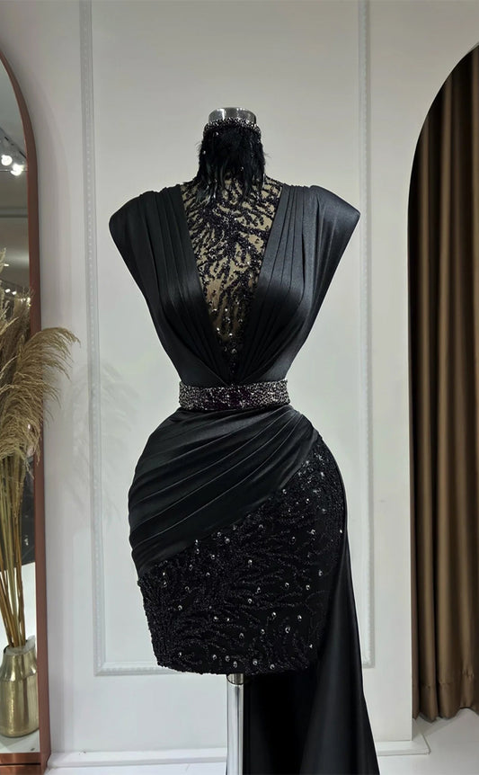 RP336-Black Sheath/Column High Neck Appliqued Beaded Pleated Cap Sleeves Short Prom Evening Dresses Formal Party Gowns With Train