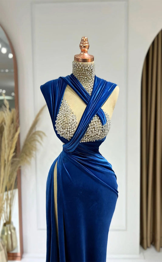 RP337-Royal Blue Mermaid High Neck Beaded Crystals Pleated Prom Evening Dresses Formal Party Gowns With Slit