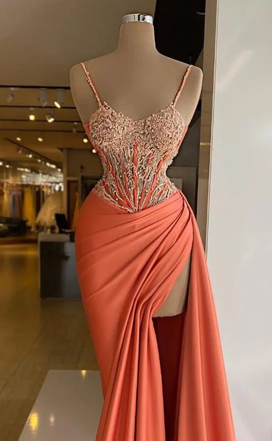 RP355-Orange Sheath/Column Spaghetti Pleated Appliqued Sleeveless Prom Evening Dresses Formal Party Gowns With Slit
