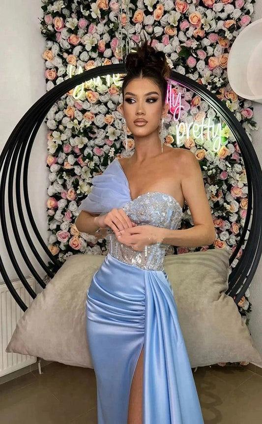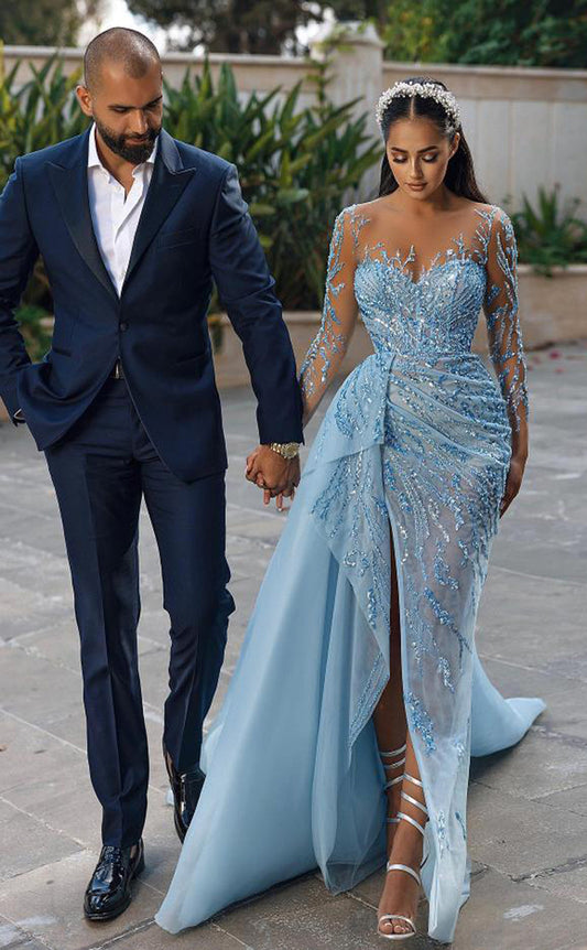 RP200-Sky Blue Sexy Mermaid Sweetheart Long Sleeves Sequined Appliqued Prom Dresses Evening Party Gowns With Slit