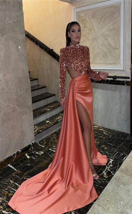 RP125-Orange Sheath High Collar Beads Long Sleeves Sweep Train Long Formal Prom Evening Dresses Party Gowns With Side Slit