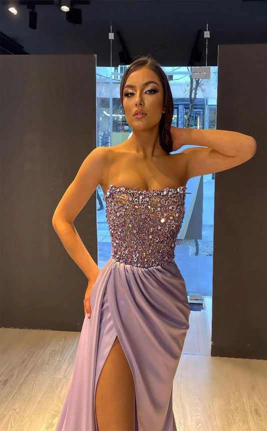 RP126-Charming Sheath Strapless Beads Sleeveless Sweep Train Long Formal Prom Evening Dresses Party Gowns With Side Slit