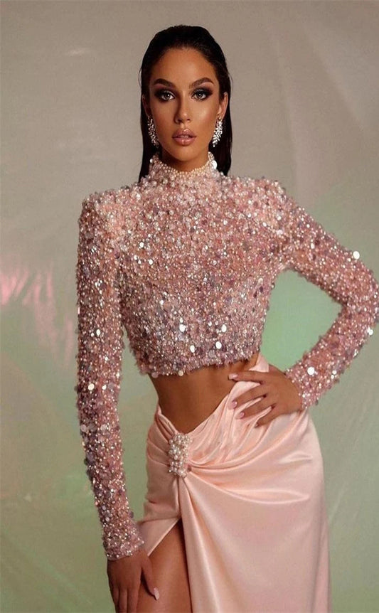 RP128-Two Pieces Sheath High Collar Beads Pearls Long Sleeves Sweep Train Long Formal Prom Evening Dresses Party Gowns With Side Slit
