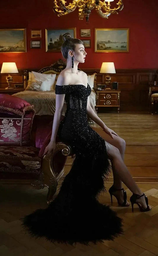 RP129-Black Sheath/Column Off-the-Shoulder Short Sleeves Sequins Long Prom Evening Dresses Formal Party Gowns With Slit