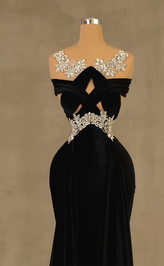 RP116-Special Black Mermaid Sweetheart Beaded High Side Slit Court Train Velvet Long Prom Dresses Formal Party Evening Gowns