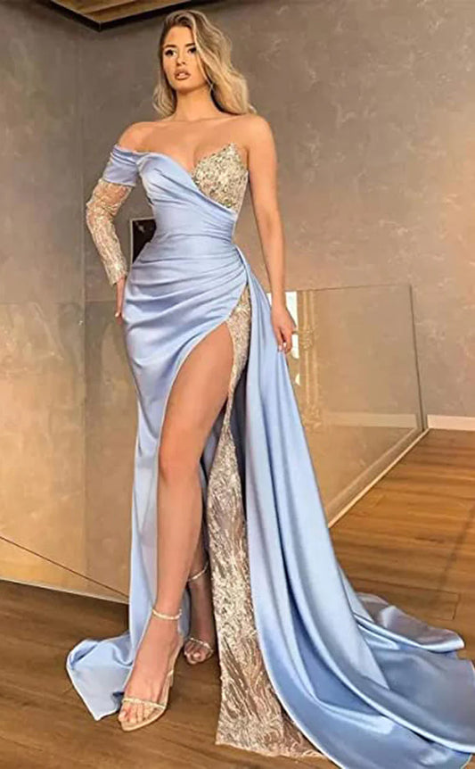 RP032-Elegant Mermaid Sweetheart One Long Sleeve Beads Appliques Lace Up Satin Long Formal Prom Evening Dresses Party Gowns With Slit