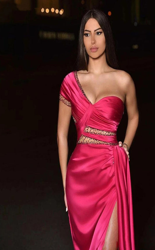 RP031-Fuchsia Sheath One Shoulder Beads Pleated Backless Satin Long Formal Prom Evening Dresses Party Gown With Slit