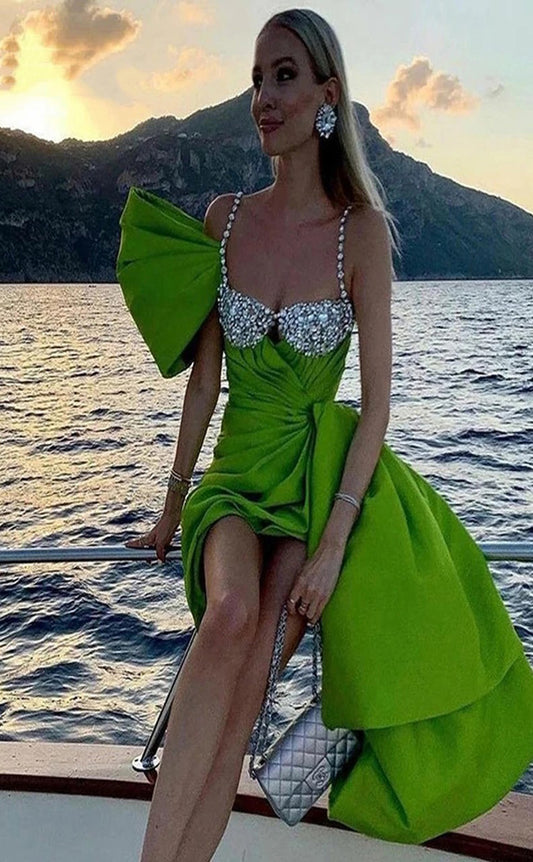 RP028-Green Sheath Spaghetti Strap Beaded Crystals Pleated Bow Satin Short Summer Formal Prom Cocktail Dresses Party Gowns