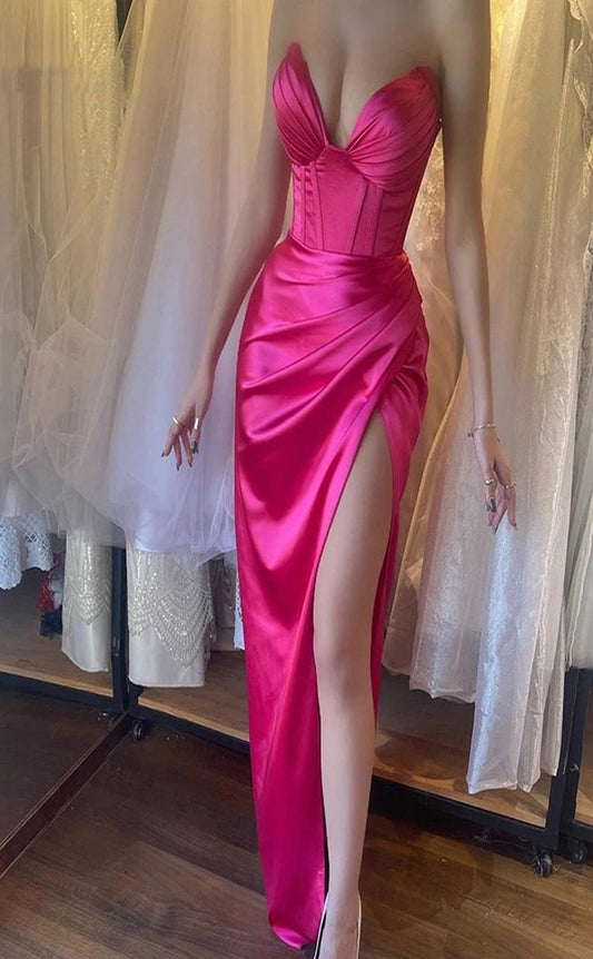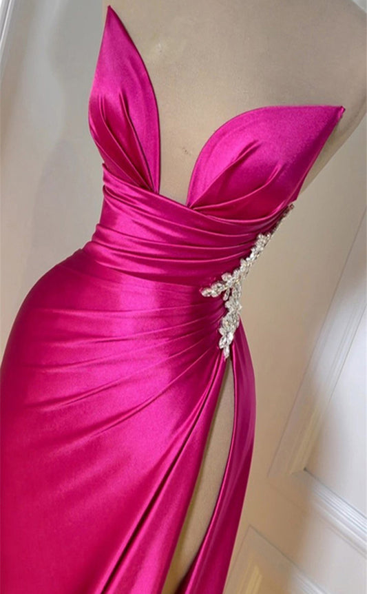 RP023-Hot Pink Mermaid Sweetheart Beads Pleated Crystals Long Satin Prom Evening Dresses Formal Party Gowns With Slit