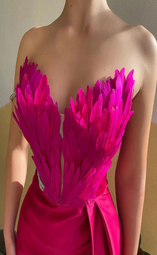 RP017-Sky BLue Mermaid Strapless Feather Off the Dhoulder Beads Satin Long Prom Evening Dresses Party Gowns With High Split