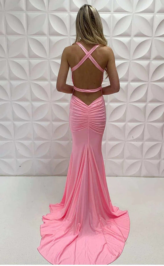 RP033-Light Pink Mermaid Spaghetti Backless Sleeveless Pleated Satin Long Formal Prom Evening Special Party Gowns