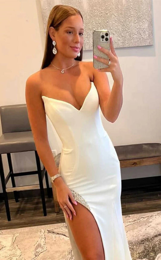 RP042-Simple White Mermaid Strapless Backless Satin Long Formal Prom Evening Dresses with Bead Trimmed Slit